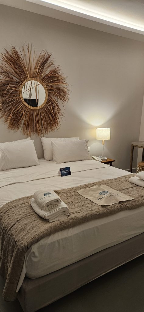 Am Pool läuft im Hintergrund Housemusik. Etwas abseits im Resort liegt das Gym, dies war tatsächlich gar nicht so einfach zu finden, da man kurzzeitig das Hotel dafür verlassen muss. Für ein Hotel dieser Kategorie könnte es etwas besser ausgestattet sein. Es ist alles notwendige da und der Meerblick vom Laufband entschädigt dies! Es werden auch Massagen angeboten. Ein richtiges Spa gibt es jedoch nicht. Trotz der verwinkelten Anlage funktioniert das WLAN so gut wie überall ausgezeichnet. Ein Hinweis für die TV Junkies…deutsches TV gibt es keines. Hier muss man auf Onlinevarianten ausweichen. Die Zimmer sind im Boho-Style eingerichtet. Es gibt mehrere Zimmertypen, u.a. welche mit eigenem, kleinen Pool. Hoteleigene, kostenlose Parkplätze sind vorhanden. Ebenso kann man auf der Seite an der Straße parken um das Hotel herum.